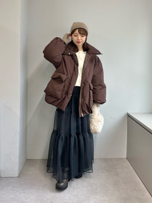 ボリュームのあるブラウンのダウンジャケットに、黒のシアースカートをあわせたフェミニンカジュアルコーデです。重厚感のあるアウターと透け感のある軽やかなティアードスカートの異素材ミックススタイルで、冬の装いにおしゃれな奥行きを演出します。