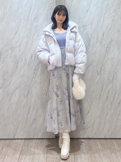 上半身をコンパクトに見せるダウンジャケットと、ボリュームのあるロングスカートのバランスが絶妙。足元は黒のブーツで全体を引き締めて、統一感を演出しています。カジュアルさと上品さを両立させたレディな着こなしです。