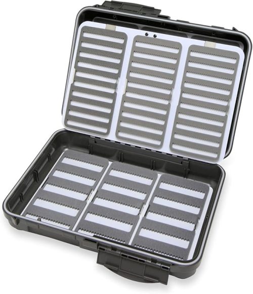 水面に浮かぶドライフライと水中に漂うニンフフライの収納に対応したおすすめのフライボックス。コンパートメントにはドライフライを収納、フォームにはニンフフライを刺すことで、使い分けしやすいのが特徴です。