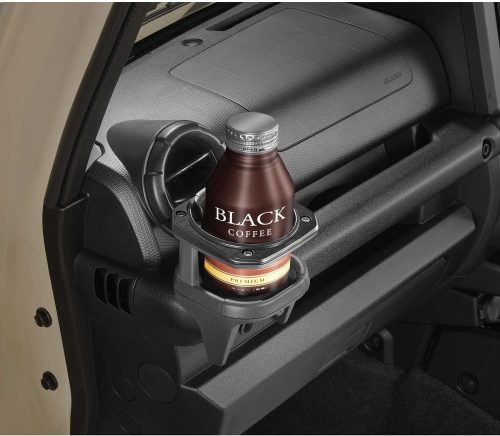 細い缶から600mlペットボトルまで確実にホールドし、走行中の揺れにも安定感があります。ジムニーの内装にマッチするブラックカラーで、純正品のような一体感を実現。高さ126×幅100×奥行95mmのコンパクト設計です。