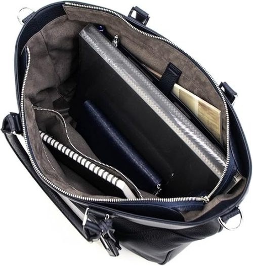ファスナー式のメインコンパートメントを備えたトートバッグです。内部には保護パッド入りのポケットがあり、PCやタブレットを安心して収納できます。さらにペンループ・カードホルダー・オープンポケットなど充実した内装で整理整頓しやすい構造です。