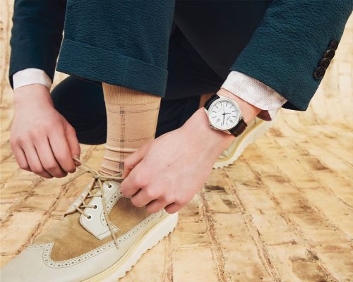 本モデルは真鍮ケースとステンレススチールバンドを組み合わせた仕様。ネイビーの文字盤とシルバーのバーインデックスで、紺色のスーツと合わせると統一感を演出でき、おすすめです。