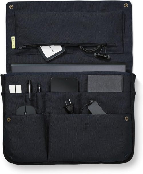 多彩なポケットが搭載された機能的なレイアウトもポイントです。ペン・スマホ・ACアダプタ・マウスなどがそれぞれすっぽりと収まるサイズ・形状のポケットを配置。フラップ部分の裏には、細々としたモノをまとめておくのに便利なファスナーポケットが設けられています。