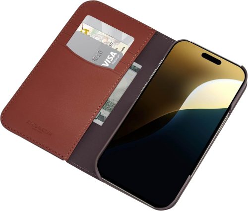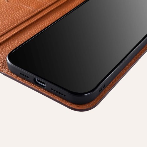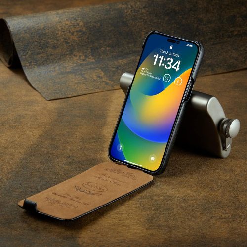 縦方向に開くおすすめの手帳型iPhoneケース。高品質な合皮が素材に使われており、高級感のあるデザインに仕上げられています。縦開きなのでフラップが邪魔になりにくく、スムーズに開いて片手で快適に操作可能です。
