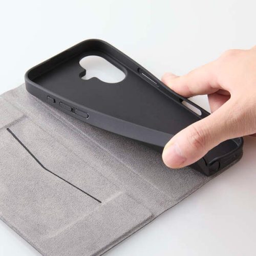 一般的な手帳型ケースよりも薄く、手に収まりやすいのもポイント。カード入れとフリーポケットも搭載されているので、カードや定期券、お札などをiPhoneと一緒に持ち歩けます。
