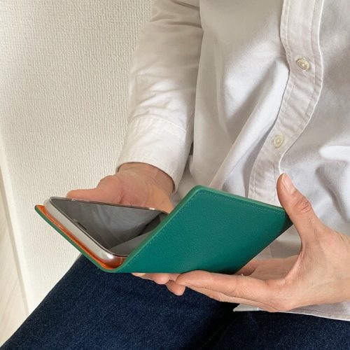 職人が丁寧に作り上げている手帳型iPhoneケース。外側には、空打ち加工を施したフルグレインレザーを採用しています。シボ模様が、個性的な表情を生み出すのが魅力です。