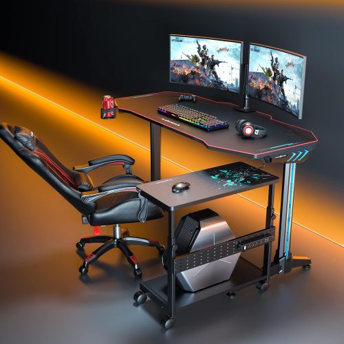 高さ調節機能を備えたゲーミング向けPCワゴン。上部天板は55~85cmまで7段階に調節でき、デスクの高さに合わせて柔軟にセットできます。各天板の耐荷重は40kgで、合計80kgまで対応。パソコン本体やゲーム機器を安定して収納できるのが魅力です。