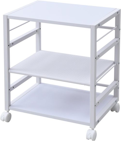各棚の耐荷重は10kgで、天板と棚板の位置は用途に合わせて調整可能。また、直径5cmのキャスターを搭載しており、移動はスムーズに行えます。