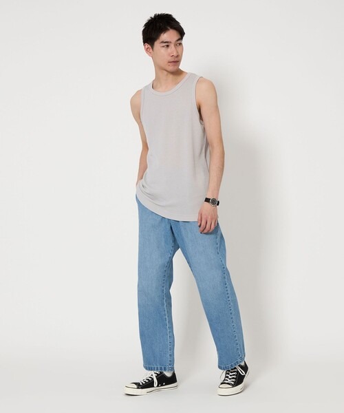 少し薄手のリブ生地で、夏でも快適に着用できるタンクトップ。インナーとして使いやすく、シャツと合わせるレイヤードスタイルにおすすめです。