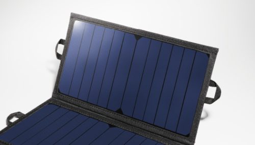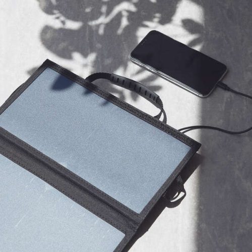 太陽光でスマホを充電できる、折りたたみ式ソーラー充電器です。サンパワー社のソーラーパネルを採用し、21.9〜23.4%の高い変換効率を実現しています。収納時はB5サイズになり、携帯性も良好です。