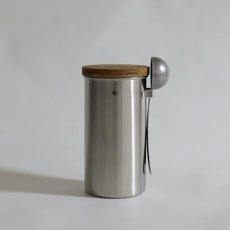 有名な金属加工の産地として知られている、新潟県燕市で製作している製品。ステンレス製でツバメのシルエットが入ったデザインは、シンプルながら高級感があります。横にメジャースプーンが収納できるフック付き。ふたは樹脂パッキン仕様なので、密封性にこだわりたい方にも適しています。
