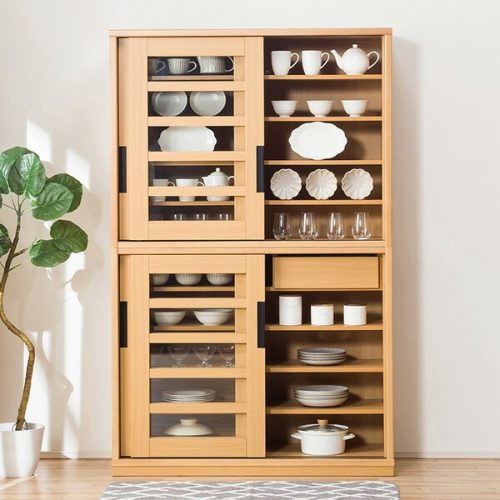 省スペースで設置できるガラス引き戸付き食器棚。透明ガラスの扉により、お気に入りの食器を美しくディスプレイしながら収納できます。開閉時に場所を取らない引き戸タイプで、限られたキッチンスペースでも使いやすいのが魅力です。