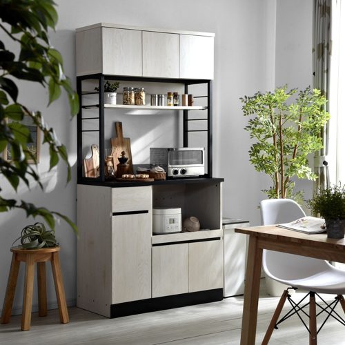約幅90.3×奥行き45.3×高さ184.3cmのサイズで、食器類からキッチン雑貨まで余裕を持って収納可能。多機能な食器棚を求める方におすすめです。