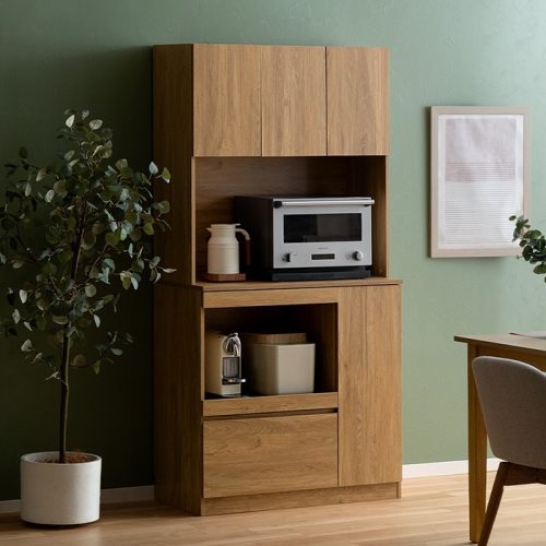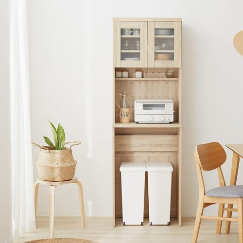 ゴミ箱を美しく隠せるスリム設計の食器棚。幅60cmと90cmから選べるサイズ展開で、限られたキッチンスペースを有効活用できます。使用頻度が高い箇所にはメラミン加工を施しており、汚れに強く日常使いに適した仕様です。