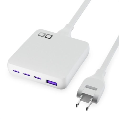 4ポートGaN技術を採用した高出力充電器。MacBook Pro 16インチを約28分で50%まで急速充電できます。100W出力のUSB-Cポートを搭載。USB-Cポートは3つ、USB-Aポートは1つあり、複数デバイスの同時充電に対応します。