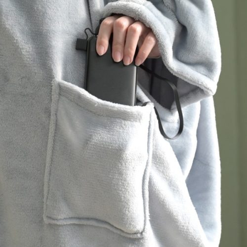 腕を通せる穴付きの、着るタイプの電気毛布。あたたかさを保ちながらスマホやゲーム操作が快適にできる設計です。首や肩までしっかりとあたたかく包み込みます。