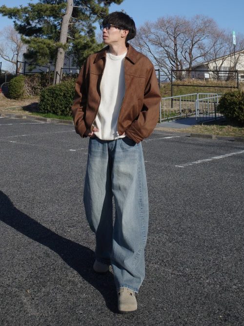 ブラウンのスエード調ブルゾンを主役にしたカジュアルスタイルです。インナーにはクリーンなホワイトのトップスを合わせ、顔まわりを明るい印象に演出。ボトムスは色落ち感のあるワイドデニムを選択しています。