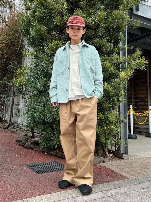 淡いグリーンのシャツを主役にした、春らしいリラックスカジュアルコーデです。インナーにはストライプ柄のシャツをあわせることで、爽やかな印象をプラス。全体的にゆったりとしたシルエットでまとめています。