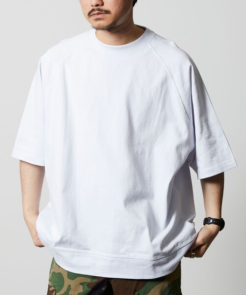 半袖スウェットのようなラグランスリーブと裾リブデザインで、カジュアルファッションに合うヘビーウェイトTシャツです。9オンスの厚い生地を使用しながらも、柔らかで重すぎない快適な着心地が魅力。透け感はないので、1枚でさらっと着られます。