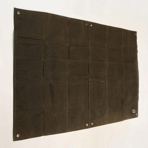 パラフィン成分の特性により、通常の帆布に比べて撥水効果が高いのが魅力です。四隅には金属製ハトメを装備し、ヴィンテージな風合いを演出。ハトメ周辺は生地を二重に縫い付けているため、太めのペグにも対応できます。