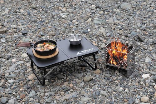 車中泊での食事をより快適にするコンパクトな折りたたみテーブル。カマドスマートグリルB6型の収納も可能な便利グッズです。収納時には小物入れスペースも確保され、薄型設計でスペースを有効活用できます。