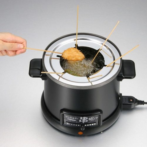 串揚げに特化した設計の卓上電気フライヤー。串ホルダー付きで、家族団らんの串揚げパーティを手軽に楽しめます。160~200℃まで温度調節が可能で、食材に合わせて設定できるのがメリットです。