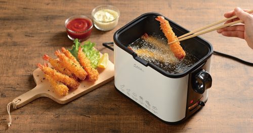 少量の油で気軽に揚げ物を楽しめる電気フライヤー。約0.5Lの油で効率よく調理でき、一人暮らしやお弁当作りに重宝します。