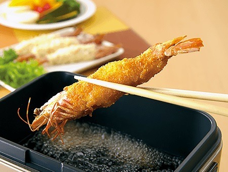 自宅で簡単においしい揚げ物を楽しめる電気フライヤー。食卓で揚げたてのエビフライや串揚げを作れるため、できたての味わいを堪能できます。角型デザインで大きなエビも余裕を持って調理しやすいのが特徴です。