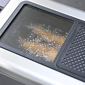 約50〜200℃まで温度調節が可能。から揚げやエビフライ、ポテトチップスなど多彩な揚げ物に対応します。フタは油切りスペースと一体化した作りで、揚げたての食材をそのまま置けるのが便利なポイントです。