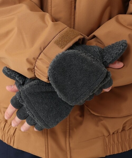 フィンガーレスにもなるミトンタイプの手袋。パイル編みのボア素材を採用し、あたたかみのある立体感とやわらかな肌触りを実現しています。甲側にはボア生地、手のひら側にはマイクロフリースを使用し、機能性とデザイン性を両立しているのもポイントです。