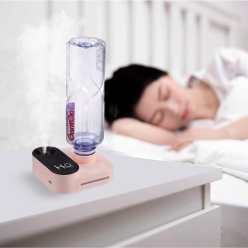 500ml以下の市販のペットボトルに対応。水道水を入れたペットボトルを本体に取り付け、電源ボタンを操作するとミストが出る仕様です。空気の乾燥具合や好みに合わせて、「一定モード」と「リズムモード」を切り替えられます。