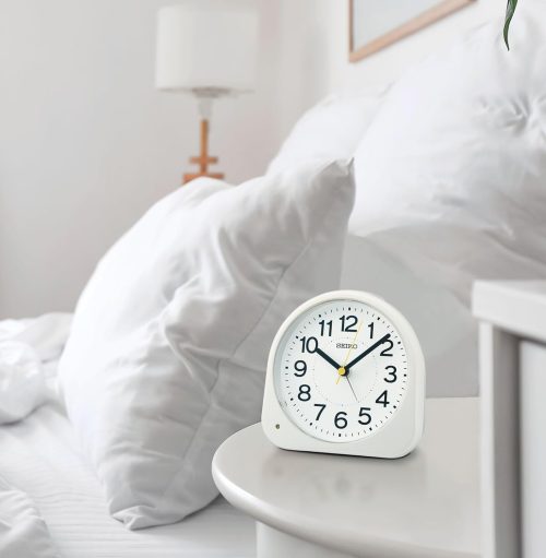 4段階で変化する電子音アラームを搭載。スヌーズ機能も備えているので二度寝防止に役立ちます。ライト機能付きでボタン1つで文字盤を照らせるので、夜間の時刻確認もスムーズです。