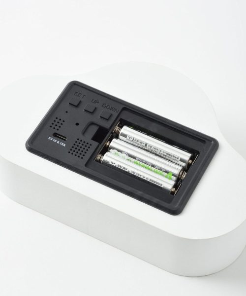 LEDディスプレイには、表示を切り替えることで時刻に加えて日付や温度を表示可能。電源はUSBケーブルでの給電か、単4電池3本での使用が可能です。操作ボタンは背面にあり、シンプルな外観を保ちながら使い勝手も考慮されています。
