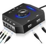 複数のポートを搭載した外付け型サウンドカードです。USBポート3つと3.5mmオーディオジャック2つ、マイク用ポート1つを搭載。最大6台のデバイスを同時に接続できます。