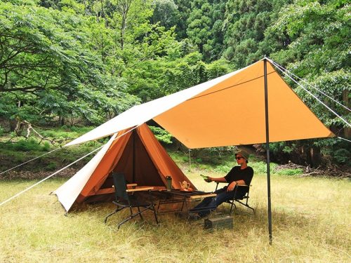丈夫なポリコットン生地を採用したワンポール型の二人用テント。火の粉が飛んでも穴があきにくく、テントの近くで焚き火を楽しめるのがメリットです。オープンタープと接続すれば、シェアハウススタイルにも対応。複数の寝室を作れるため、ファミリーキャンプやグループキャンプにもおすすめです。