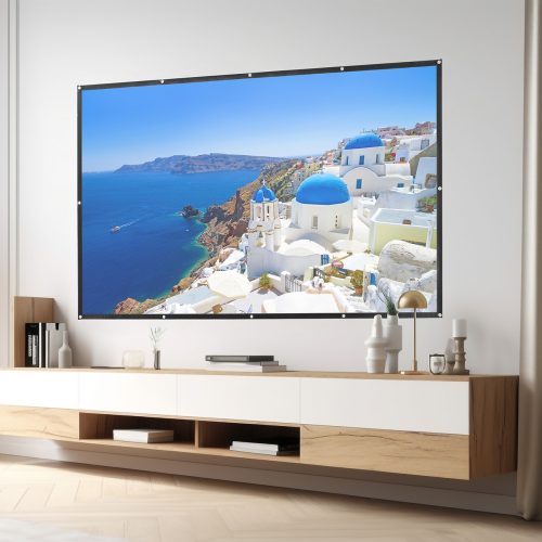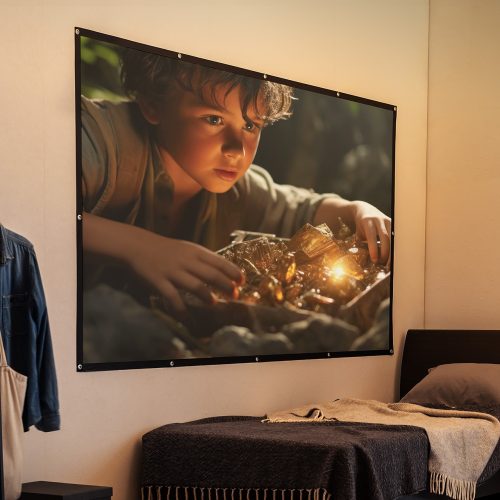 壁のフックに引っ掛けるだけで簡単に設置できるプロジェクタースクリーン。約2.8kgと軽量設計で、自宅の壁にも無理なく取り付けられます。シワがつきにくいPVC素材を採用しており、なめらかな映像を投影できるのが魅力です。