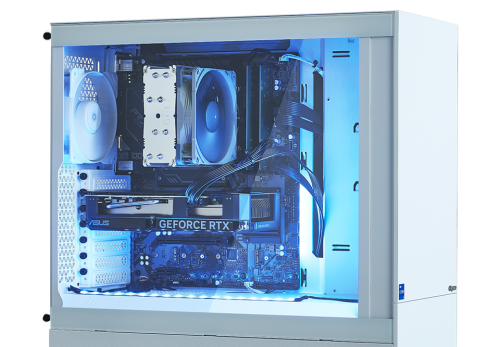ホワイトカラーで統一されたスタイリッシュなゲーミングPC。ARGBライティング対応の12cmケースファンを5基搭載しているほか、水冷ヘッドにはGALLERIAロゴが配され、視覚的な美しさと機能性を両立しています。インテリアに馴染むおしゃれなデザインが魅力です。
