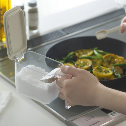 砂糖や塩のように使用頻度の高い調味料の保存には、調味料ストッカーが適しています。蓋が大きく開くので調味料を取り出しやすく、料理中にサッと計量できるのが魅力です。