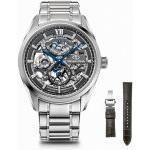 シルバーメタリックの文字盤はすっきりとしたシンプルなデザインで、上品な印象に。シースルーバックから精緻なムーブメントの動きを眺められるのも魅力のひとつ。フォーマルからデイリーまで品のある着こなしに会うアイテムを探している方におすすめです。