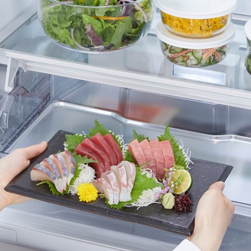 肉や魚は、凍らせない約-1℃で保存する「特鮮氷温ルーム」に置くのがおすすめ。野菜は「新鮮スリープ野菜室」に入れると、眠らせるように保存してみずみずしさを保ちます。また、アルミトレイですばやく凍らせる「デリシャス冷凍」を搭載しているのもポイントです。