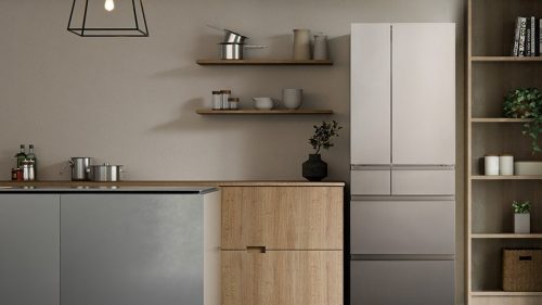 コンパクトな設置幅が魅力の、490L大容量フレンチドア冷蔵庫。独自の省スペース設計により、キッチンにすっきりと収まります。庫内はひろびろとしており、まとめ買いをする家庭にもおすすめのモデルです。