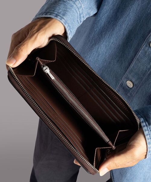 ラウンドジップ開閉式で中身をしっかりと保護。内側には複数のカードスロットやファスナー付きコインポケット、札入れやレシートを収納できるコンパートメントが備わっています。高い収納力と使い勝手のよさを兼ね備えた、タイムレスな魅力を放つアイテムです。