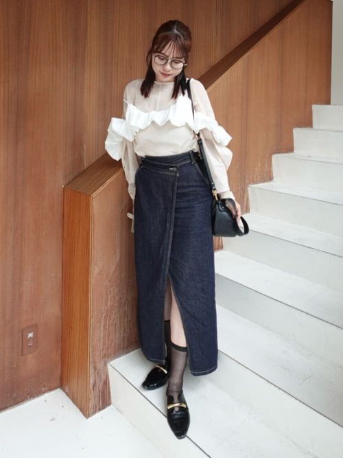 大きなフリルが華やかな最高気温24度にぴったりのスタイリングです。フェミニンなトップスとカジュアルなラップスカートの組み合わせが絶妙なバランスで、上品ながらスカートの深いスリットが着こなしに動きを加えています。