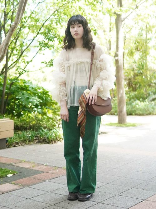 ふんわりとしたシアーブラウスに深みのあるグリーンのパンツをあわせた服装です。ボリュームのあるフリルがロマンティックなブラウスは、一枚で華やかな雰囲気を演出。カジュアルなパンツをあわせることで、甘すぎない絶妙なバランスに仕上がっています。
