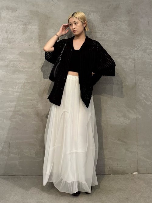 白のロングチュールスカートが目を引くモノトーンコーデです。ボリュームのあるフェミニンなスカートに、透け感のある黒のメッシュカーディガンをあわせたスタイル。インナーも黒のクロップド丈で統一し、すっきりとした印象にまとめています。甘さとクールさが共存する、洗練された雰囲気が魅力的です。