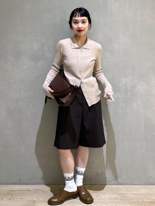 ベージュの襟付きニットに、マニッシュなピンストライプのハーフパンツをあわせた服装です。身体にフィットするリブニットが、すっきりとした上半身を演出します。ワイドなハーフパンツとの組み合わせでメリハリのあるシルエットに。秋らしい落ち着いた配色が知的な印象を叶えます。
