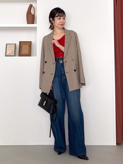 ベージュのチェック柄ダブルジャケットに、ワイドデニムをあわせたきれいめカジュアルコーデです。マニッシュなジャケットスタイルに、インナーの鮮やかな赤が女性らしさをプラス。かっちりとしたジャケットとカジュアルなデニムの組み合わせが、こなれた雰囲気を演出しています。