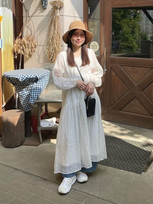裾からデニムをのぞかせたレイヤードスタイルが、着こなしのポイント。足元には白いスニーカーをあわせて、軽快なカジュアル感をプラスしています。ナチュラルなストローハットは日差し対策をしつつ、季節感を演出。街歩きはもちろん、自然のある場所へのお出かけにもおすすめです。