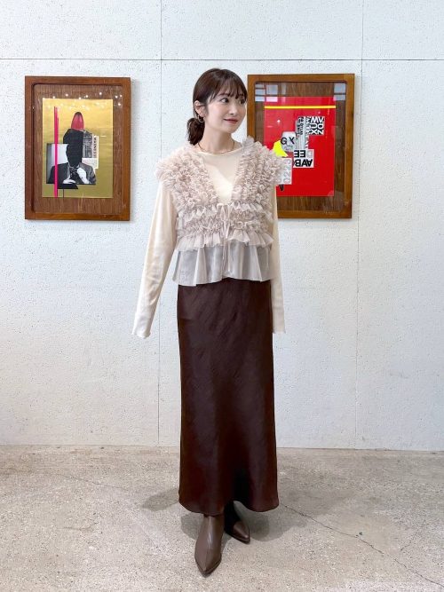フリルが華やかなベストを主役にした、上品な服装です。トップスは、ベージュのチュールインナーにフリルベストを重ねています。ボトムスには、光沢のあるブラウンのロングスカートを選択。落ち着いた色合いがトップスの甘さを引き立てつつ、大人っぽい雰囲気にまとめています。