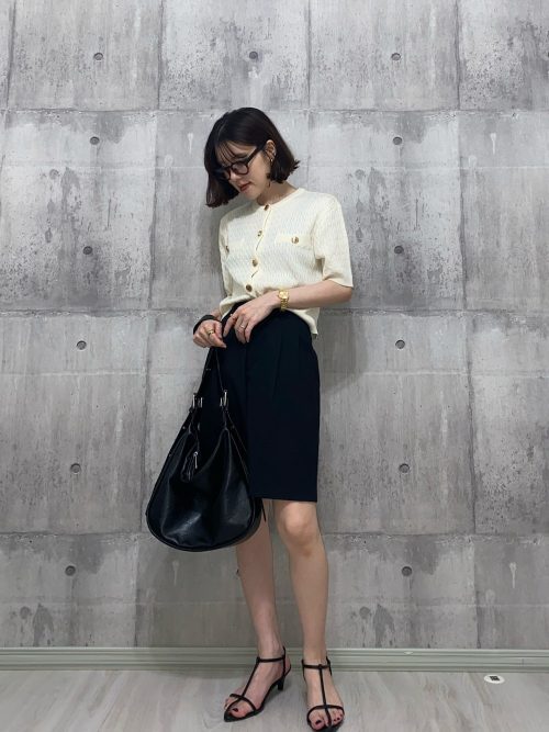 アイボリーの半袖ニットカーディガンを主役にした、きれいめカジュアルコーデです。上品なゴールドのボタンが、洗練された雰囲気をプラスします。ボトムスにはすっきりとしたシルエットの黒のハーフパンツをあわせて、程よい抜け感を演出。モノトーンでまとめて落ち着いた印象に仕上がっています。
